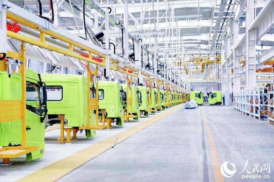 在位于宁德福安市的青拓重工生产车间内,新能源纯电动矿用运输车头依次排列在生产线上。人民网 李唯一摄